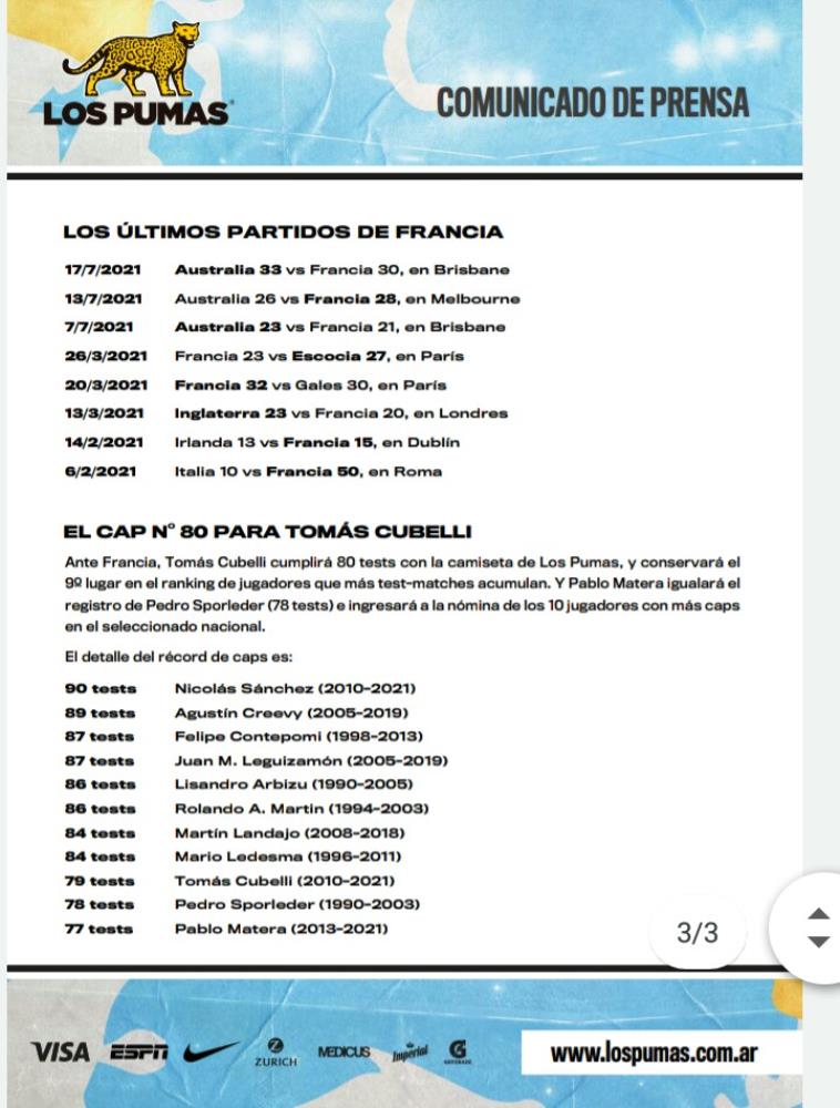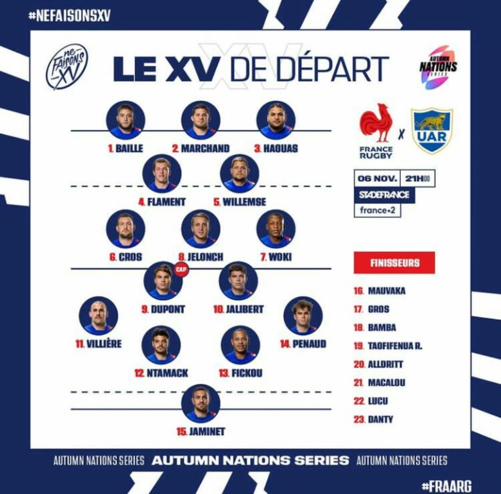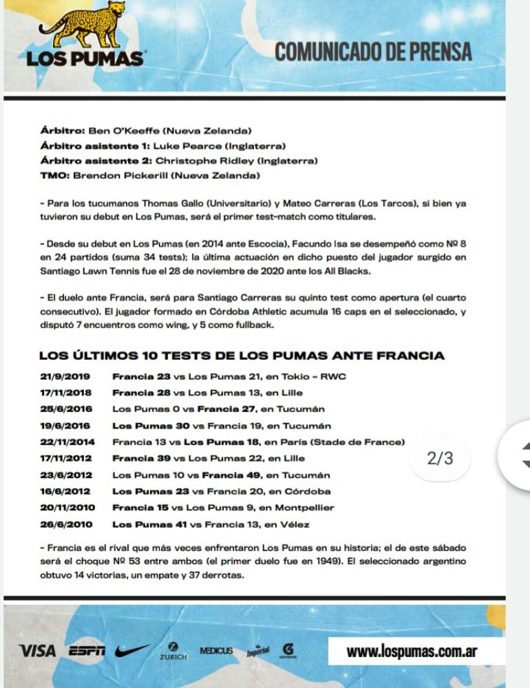 Galería de Imagenes El Head Coach del conjunto argentino, Mario Ledesma, anunció los 23 jugadores que enfrentarán al conjunto galo en el Stade de France. El entrenador argentino anunció el equipo que estará comenzando la ventana de Noviembre este sábado desde las 17.00 (hora Argentina) cuando enfrente a Francia.En Argentina, el pilar Thomas Gallo y el wing Mateo Carreras serán titulares por primera vez. Los dos jugadores fueron compañeros en el Mundial M20 que se realizó en Rosario en 2019 y ahora tendrán la oportunidad de jugar juntos desde el arranque en Los Pumas. Por su parte, Francia decidió presentar una formación con Romain Ntamack en el centro de la cancha junto a Gael Fickou, mientras que Antoine Dupont y Mathieu Jaliber serán las conductores del equipoAcá te dejamos la formación de ambos equipos: Galería de Imagenes