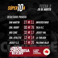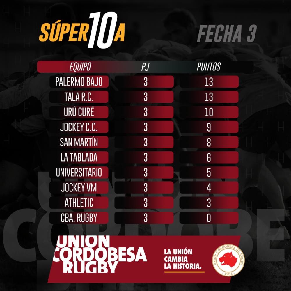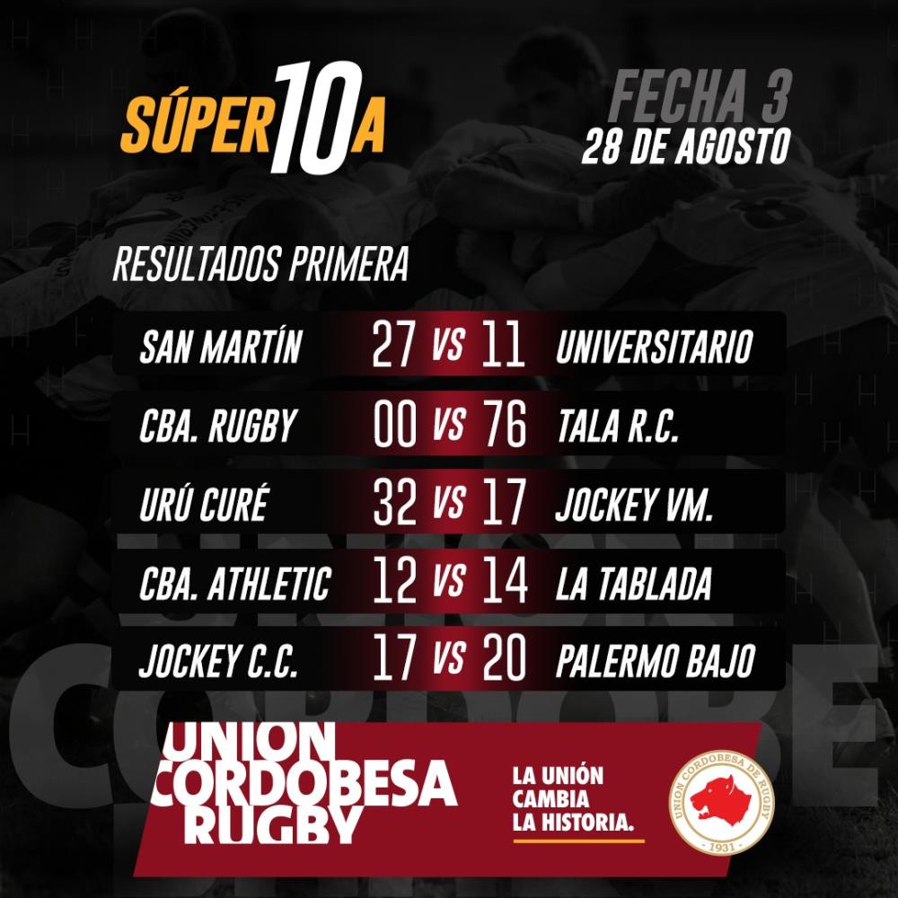 Galería de Imagenes Se disputó la tercera fecha del Súper 10 en Córdoba. En el partido destacado de la fecha, La Tablada venció a Córdoba Athletic por un ajustado 14 a 12. Además, hubo triunfos de Tala R.C ante Córdoba Rugby, de San Martín contra Universitario, de Urú Curé sobre Jockey y de Palermo Bajo ante Jockey Club de Córdoba. Los resultados del fin de semana y la tabla de posiciones: Galería de Imagenes