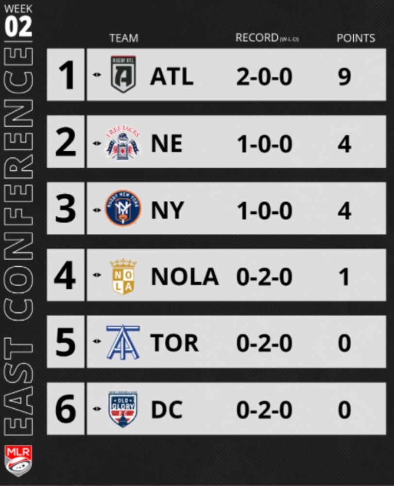 En la conferencia Este, Atlanta Rugby está en la cima de la tabla, luego de ganar los dos partidos que jugó hasta ahora, lo que marca una importante diferencia con sus competidores, ya que ninguno de los otros cinco equipos de su conferencia ganó más de un partido.