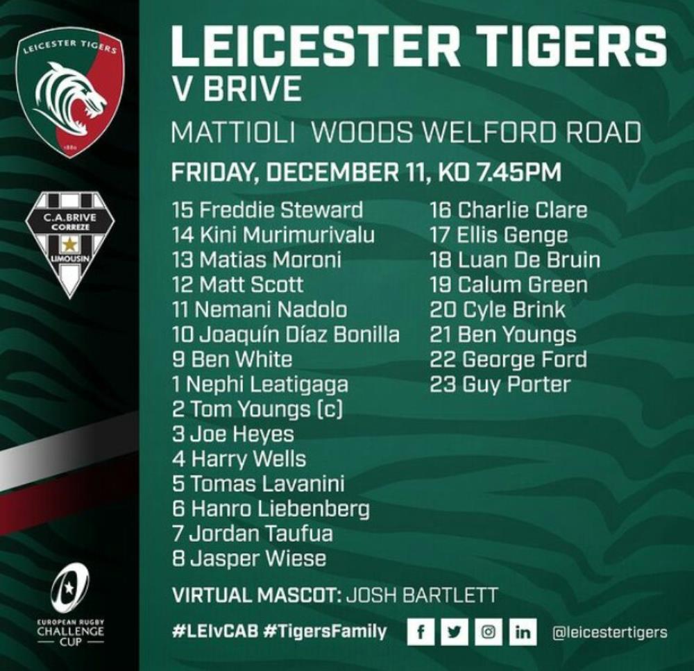 Galería de Imagenes El jugador formado en CUBA será titular en el conjunto inglés este viernes en el comienzo de la Challengue Cup, junto con Joaquín Díaz Bonilla y Tomás Lavanini. El Head Coach, Steve Borthwick, nombró a su equipo Leicester Tigers para enfrentar al visitante francés Brive en Mattioli Woods Welford Road el viernes por la noche, dónde debutará Matias Moroni.El dúo de Fiji, Kini Murimurivalu y Nemani Nadolo, serán los wines y Moroni estará junto a Matt Scott en el centro de la cancha. Joaquín Díaz Bonilla y Ben White fueron elegido para arrancar como pareja de medios.Tomás Lavanini regresa de una lesión sufrida en la semifinal de esta competencia la temporada pasada, que le impidió jugar el Tres Naciones con Argentina, y ocupará la segunda línea con Harry Wells.Habrá cobertura en vivo del juego del viernes en el sitio web de EPCR en www.ChallengeCupRugby.comLa formación del equipo: Fotógrafo: Sitio Oficial de Leicester Tigers - www.leicestertigers.com Galería de Imagenes