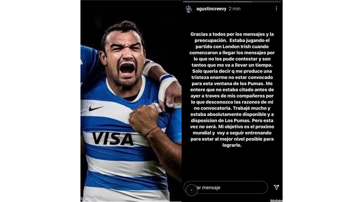 Agustín Creevy realizó su descargo por la no convocatoria a la ventana de Julio. Acá el descargo del hooker:Gracias a todos por los mensajes y la preocupación.Estaba jugando el partido con London Irish cuando comenzaron a llegar los mensajes por lo que no los pude contestar, y son tantos que me va a llevar un tiempo. Solo quería decir que me produce una tristeza enorme no estar convocado para esta ventana de Los Pumas. Me enteré que no estaba citado antes de ayer, a través de mis compañeros por lo que desconozco las razones de mi no convocatoria. Trabajé mucho y estaba absolutamente disponible para Los Pumas. Pero esta vez no será. Mi objetivo es el próximo mundial y voy a seguir entrenando para estar al mejor nivel posible para lograrlo.