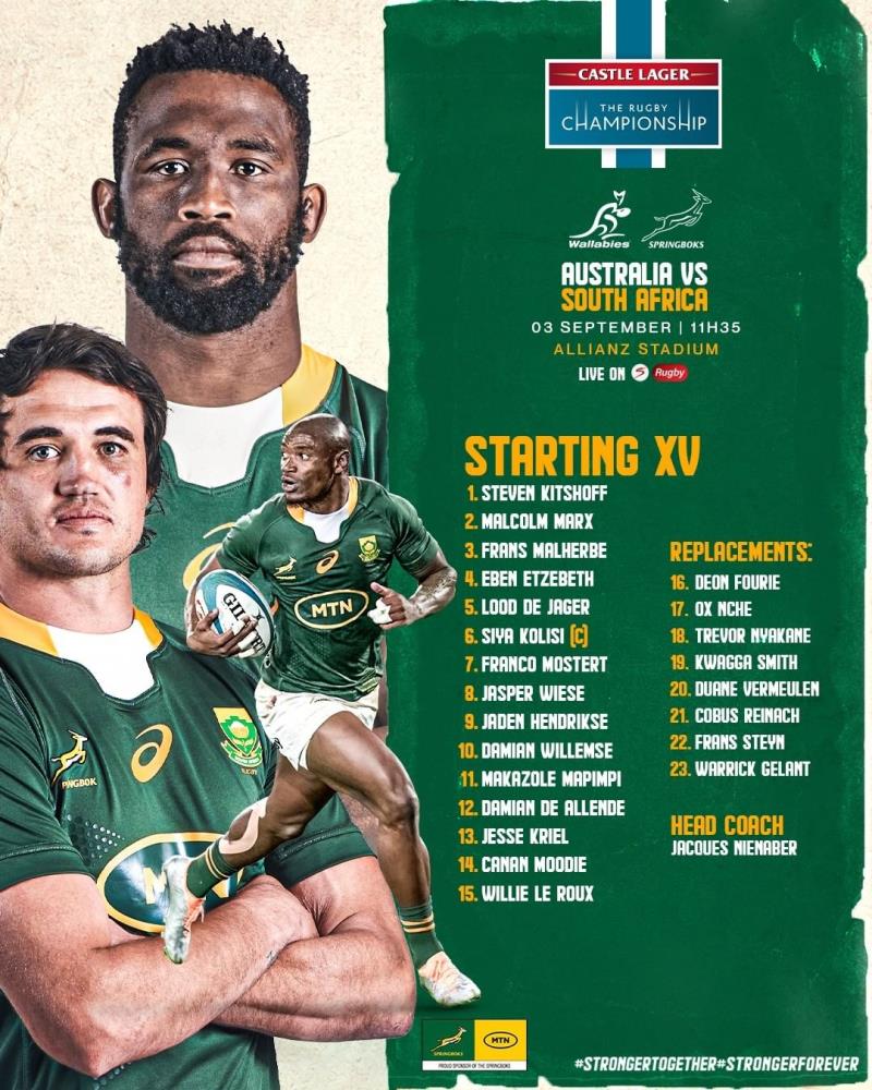 Damian Willemse pasará de fullback al puesto de apertura, Jesse Kriel se ubicará en el centro, y Franco Mostert fue incluido en la tercera línea. El joven Canan Moodie debutará con los Springboks jugando como wing con tan solo 19 años.