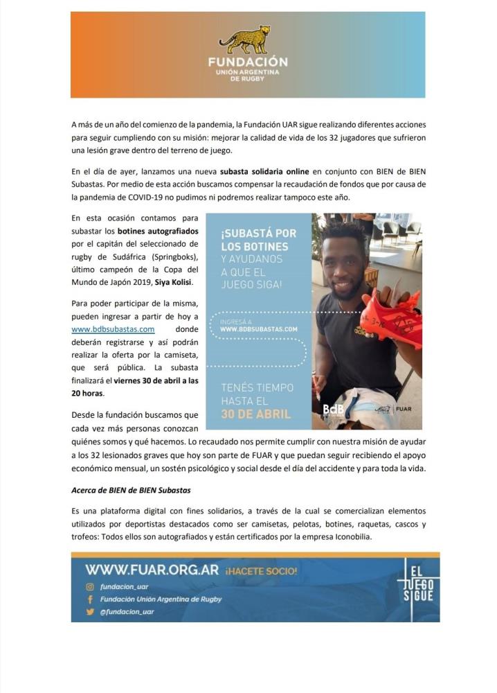 A más de un año del comienzo de la pandemia, la Fundación UAR sigue realizando diferentes acciones para cumplir con su misión: mejorar la calidad de vida de los 32 jugadores que sufrieron una lesión grave dentro del terreno de juego.