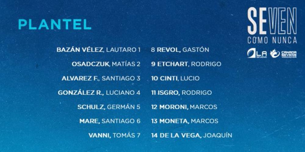 Galería de Imagenes La Unión Argentina de Rugby anunció el plantel de 14 jugadores que disputarán las próximas dos etapas del Circuito Mundial de Seven en Los Ángeles y Vancouver. El 29 de febrero debutará el seleccionado argentino en Estados Unidos ante Francia. Lautaro Bazán Vélez regresa al equipo después de superar una lesión en su rodilla izquierda que lo marginó durante dos meses. También reaparecen Marcos Moneta y Lucio Cinti, que no participan del Circuito Mundial desde abril y febrero de 2019 respectivamente. Fuente: Gentileza Prensa UAR. Galería de Imagenes
