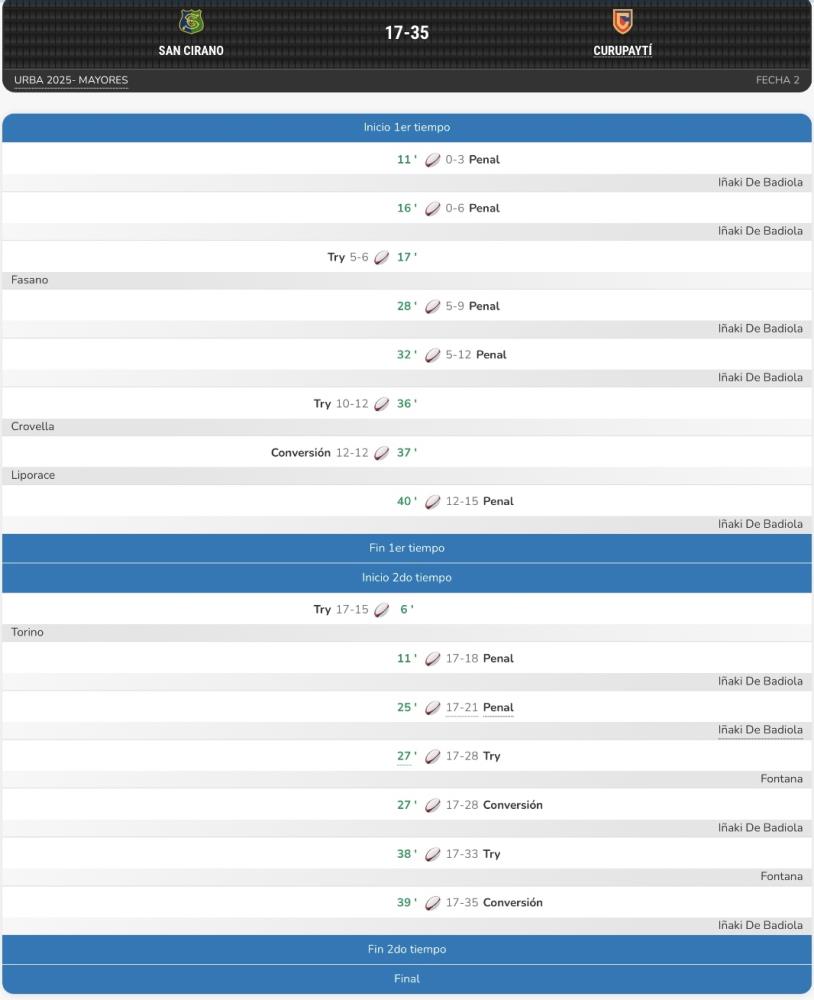 Galería de Imagenes El goleador del torneo anotó siete penales y dos conversiones para darle la victoria a su equipo frente a San Cirano. Curupaytí venció por 35-17 en su visita a San Cirano, gracias a una gran actuación de Iñaki de Badiola, quien anotó 25 puntos de los 35 de su equipo.El local, por su parte, no tuvo un buen partido y siempre estuvo lejos del marcador: para cuando ya había anotado sus tres tries (17 puntos), Curupa lo ganaba 18-17 con seis penales de su fullback. Fotógrafo: Archivo Gentileza IG: @agusstickoniuk Fuente: RCH Galería de Imagenes