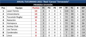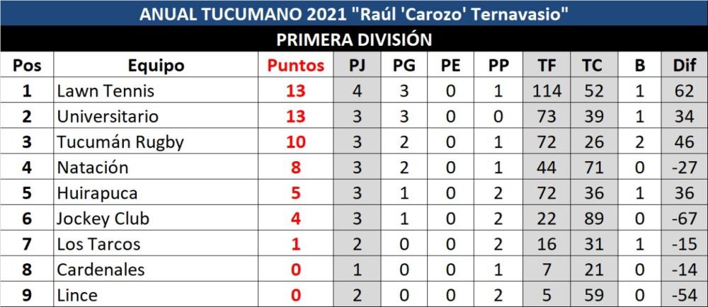 Galería de Imagenes Se jugaron dos partidos pendientes de fechas que se habían suspendido. Uno de los encuentros fue la victoria de Natación y Gimnasia sobre Cardenales por 21 a 7 en condición de visitante, los tries fueron apoyados por Martín Avellaneda, en dos oportunidades, y Rubén Ricco el otro mientras que Santiago Rodríguez convirtió todas las conversiones. Los puntos del local vinieron por medio de un try penal.El otro partido fue el ajustado triunfo de Universitario ante Huirapuca por 29 a 28 en Barrio San Martín, el primer tiempo había terminado 21 a 8 a favor de la “U”.Acá te dejamos la tabla de posiciones: Galería de Imagenes