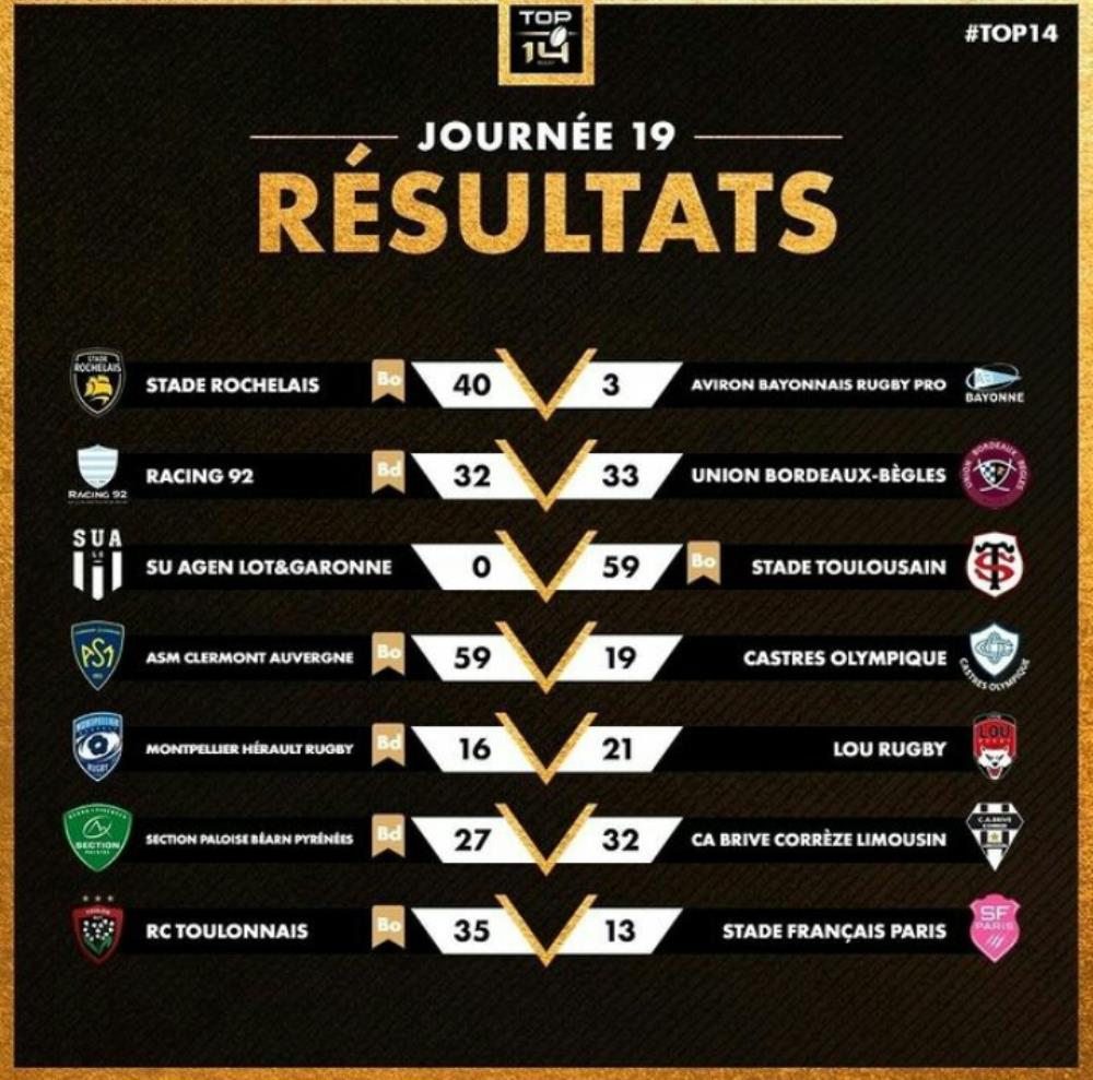 Como visitante logró un contundente triunfo ante Agen por 59 a 0 y se mantiene en lo más alto de la tabla de posiciones con 52 puntos. Sin Romain Ntamack lesionado, el medioscrum Antoine Dupont sigue como líder del equipo sensación del torneo en Francia.
