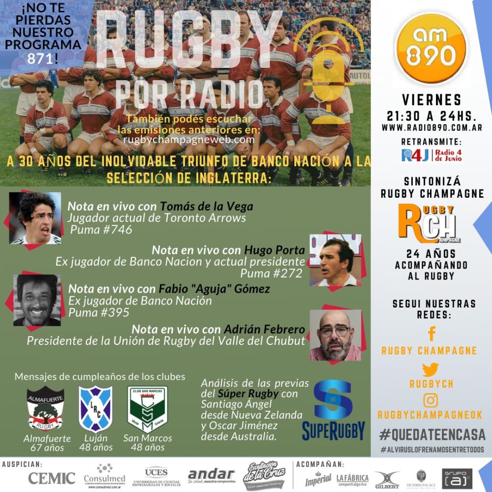 Galería de Imagenes Se emitió por Radio Libre AM890, el canal de Youtube de Radio Libre, la Radio 4 de Junio y todas sus repetidoras. En el programa 871 rememoramos la inolvidable victoria de Banco Nación a la Selección de Inglaterra a 30 años de este gran suceso y los mensajes por los cumpleaños de los clubes Almafuerte, Luján RC y San Marcos.Además tuvimos el análisis del Súper Rugby con Santiago Ángel desde Nueva Zelanda y Oscar Giménez desde Australia.Hubo notas en vivo con Tomás de la Vega (Puma 746 y actual jugador de Toronto Arrows), Hugo Porta (Puma 272 y ex jugador de Banco Nación y actual Presidente), Fabio “Aguja” Gómez (Ex jugador de Banco Nación y Puma 365) y Adrián Febrero (Presidente de la Unión del Valle de Chubut).Acá te dejamos el programa completo: Galería de Imagenes