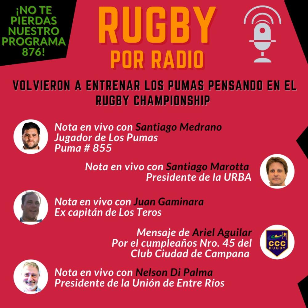 Galería de Imagenes Se emitió por Radio Libre AM890, el canal de Youtube de Radio Libre, la Radio 4 de Junio y todas sus repetidoras. En el programa 876 hablamos sobre la vuelta a los entrenamientos de Los Pumas pensando en el Rugby Championship.Además tuvimos el mensaje de Ariel Aguilar por los 45 años del Club Ciudad de Campana.Hubo notas en vivo con Santiago Medrano (jugador de Los Pumas y Puma #855), Santiago Marotta (Presidente de la URBA), Juan Gaminara (ex capitán de Los Teros) y Nelson Di Palma (Presidente de la Unión de Entre Ríos).Acá te dejamos el programa completo: Galería de Imagenes