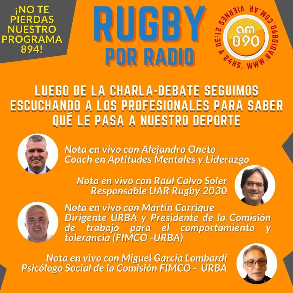 Galería de Imagenes Se emitió por Radio Libre AM 890, el canal de Youtube de Radio Libre, Radio 4 de Junio y todas sus repetidoras. No te podes perder nuestro programa 894! Luego de la charla-debate seguimos escuchando a los profesionales para saber qué le pasa a nuestro deporte. Tuvimos notas en vivo con Raúl Calvo Soler (Responsable UAR - Rugby 2030), con Miguel García Lombardi (Psicólogo social de la Comisión FIMCO - URBA), con Alejandro Oneto (Coach en Aptitudes Mentales y Liderazgo) y con Martín Carrique (Dirigente URBA y presidente de la Comisión de trabajo para el comportamiento y la tolerancia FIMCO - URBA) Acá te dejamos el programa completo: Galería de Imagenes