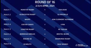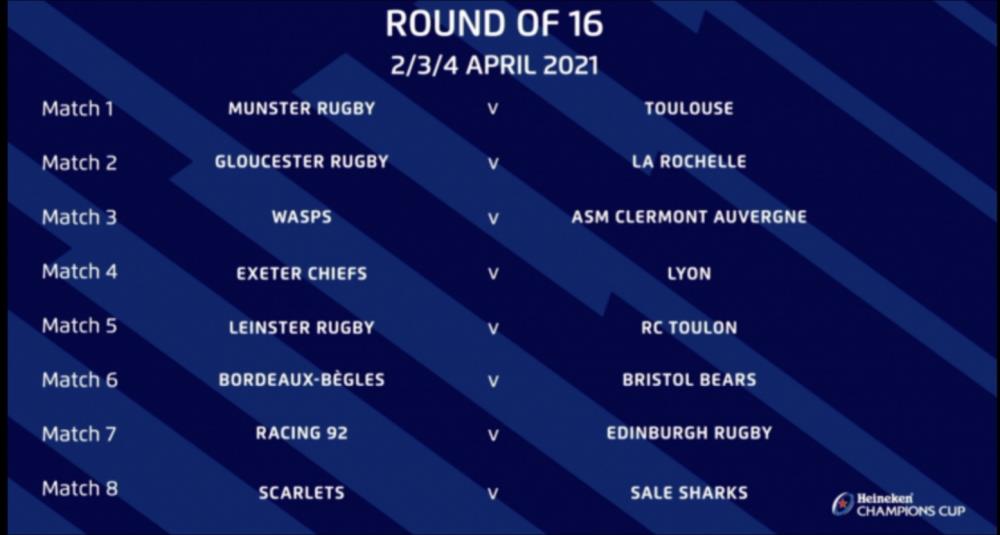 Galería de Imagenes En enero, la Copa de Campeones fue suspendida temporalmente siguiendo una directiva del gobierno francés sobre la participación de los clubes del país en ambas competiciones en medio de la pandemia Covid-19. En un formato revisado, las etapas del grupo se acortaron a favor de pasar directamente a los partidos eliminatorios.Los partidos de octavos de final de ambas competiciones tendrán lugar el fin de semana del 2/3/4 de abril, y los cuartos de final estarán programados para el siguiente fin de semana (9/10/11 de abril).COPA DE CAMPEONES (2/3/4 de abril)Munster v Toulouse Gloucester v La RochelleWasps v Clermont Auvergne Exeter Chiefs v LyonLeinster v ToulonBordeaux Begles v Bristol BearsRacing 92 v Edinburgh RugbyScarlets v Sale Sharks Galería de Imagenes