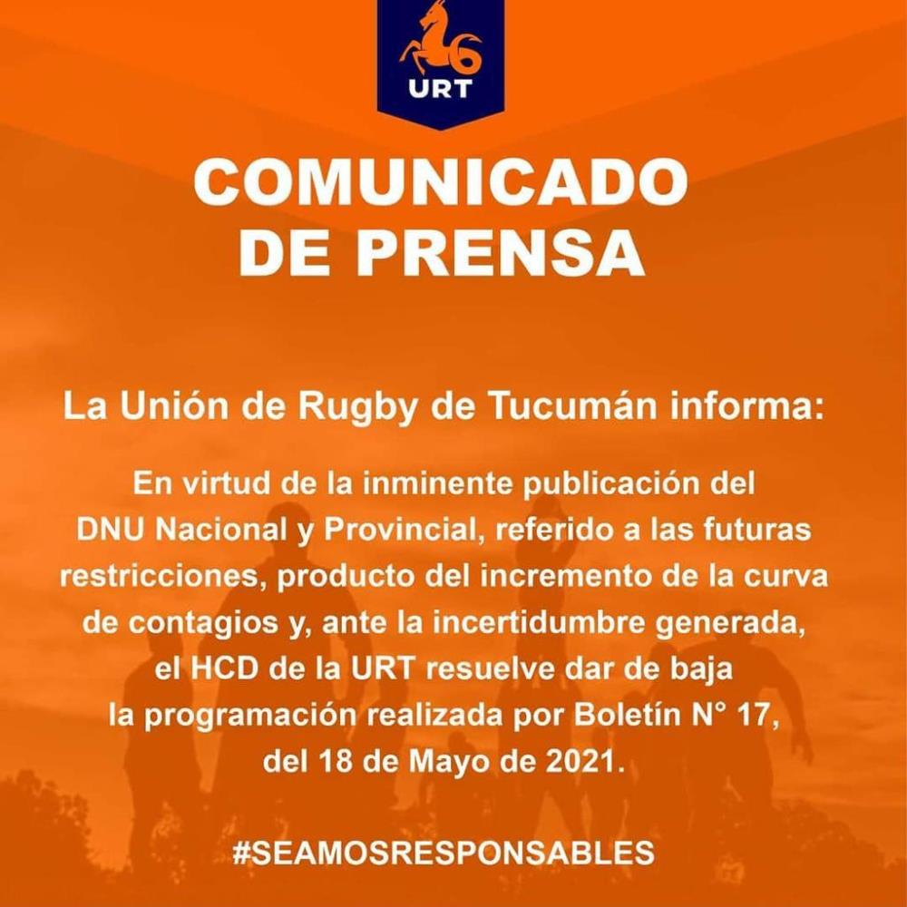 Galería de Imagenes La unión tucumana resolvió postergar su cronograma de partidos previstos para este fin de semana. El consejo directivo de la Unión de Rugby de Tucumán decidió ayer suspender los partidos programados según el boletín N°17 emitido el día 20 de mayo debido a los DNU nacional y provincial promulgaron para impedir y bajar la curva de contagios de Covid-19.Acá el comunicado: Galería de Imagenes