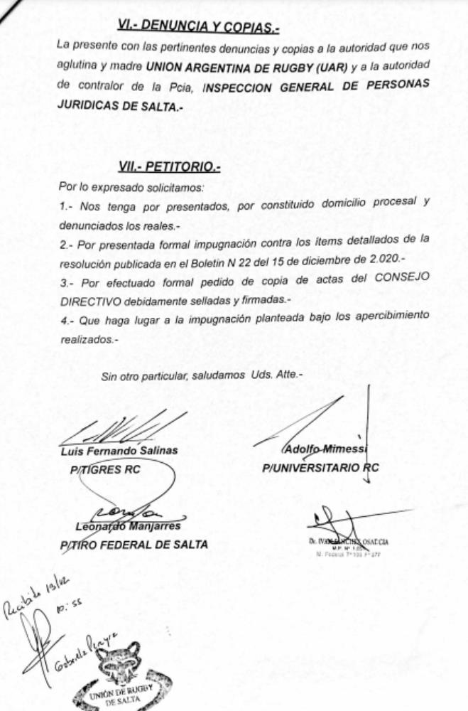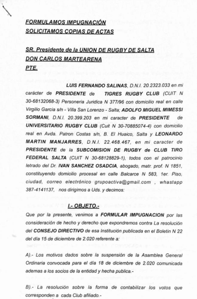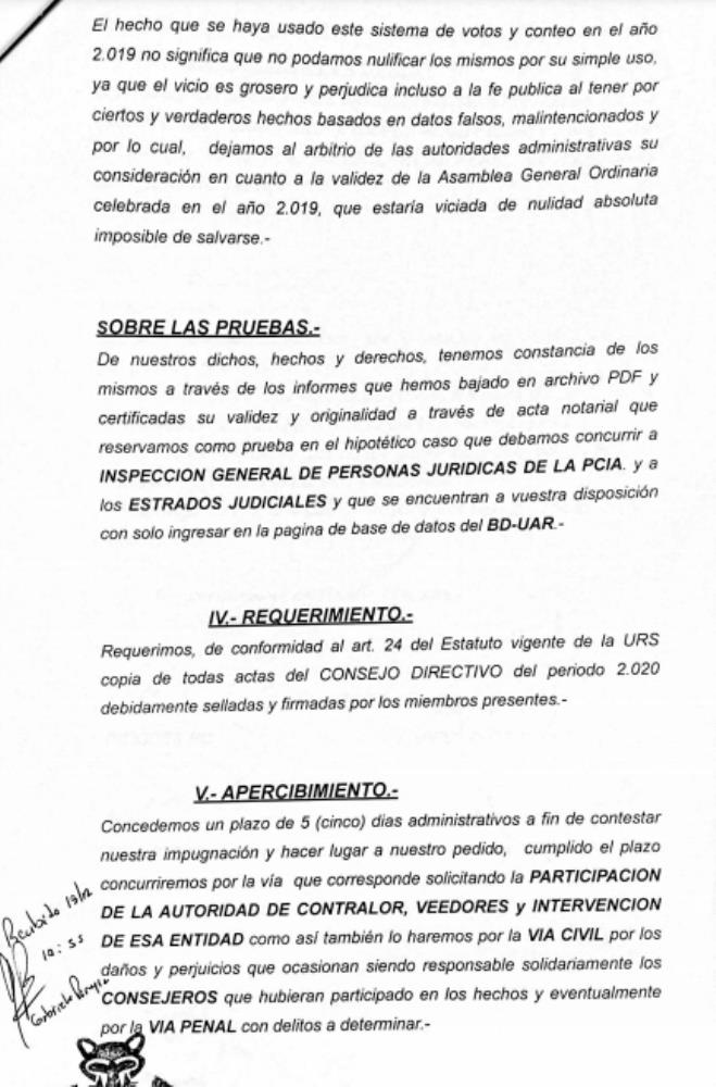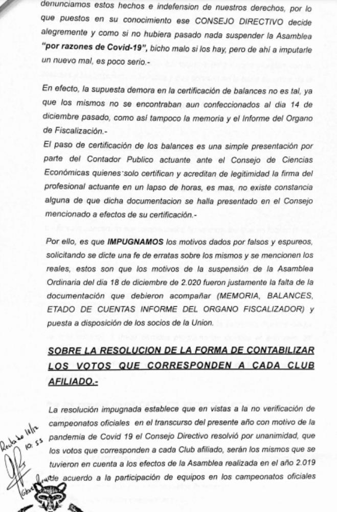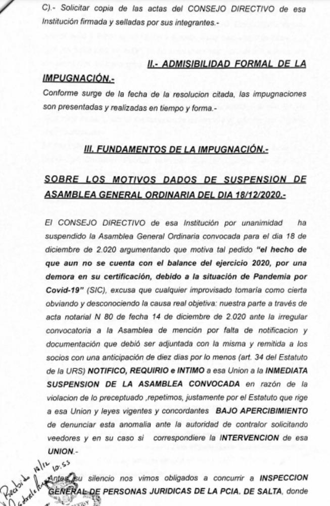 Galería de Imagenes Carlos Martearena, Presidente de la URS, dio por suspendida la Asamblea ante una posible intervención por parte de los clubes, al no poder justificar la falta de balances, presentación de gastos y rendición de cuentas. A raíz de estos hechos, clubes importantes de la provincia como Tigres, Universitario y Tiro Federal, IMPUGNARON los motivos dados con respecto a la suspensión de la Asamblea citada para el día de la fecha, a través de sus abogados, Dr. Iván Sánchez Osadcia y el Dr Diego Javier Rivetti. El COVID 19, según relatan los abogados, le sirvió de excusa justa para la falta de documentación obligatoria (memoria, balances, informes) que tenían que ser tratadas hoy en Asamblea, evitando dar los verdaderos motivos: no existe tal documentación y las intimaciones y denuncias ante Inspección de Persona Jurídicas de Salta. A continuación, adjuntamos las imágenes del acta firmada por los presidentes de los clubes. Fuente: Agenda Salta Galería de Imagenes
