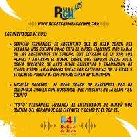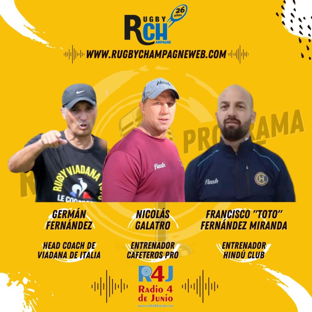 Galería de Imagenes Te esperamos desde las 17hs como todos los miércoles en la Radio 4 de Junio o desde nuestra web, con toda la actualidad del rugby local e internacional. LOS INVITADOS DE HOY: GERMÁN FERNÁNDEZ EL ARGENTINO QUE ES HEAD COACH DEL VIADANA NOS CUENTA COMO ESTÁ EL RUGBY ITALIANO, NOS HABLA DE LOS ARGENTINOS EN EUROPA, QUE EXTRAÑA DE LA UAR, LOS PUMAS Y ANTICIPA EL NUEVO CARGO QUE TENDRÁ DESDE JULIO COMO DIRECTOR DE ALTO NIVEL JUVENTUD Y TRANSICIÓN DE ITALIA RUGBY //// ANALIZAMOS TODAS LAS CATEGORIAS DE LA URBA Y EL QUINTO PUESTO DE LOS PUMAS SEVEN EN SINGAPUR // NICOLÁS GALATRO EL HEAD COACH DE CAFETEROS PRO DE COLOMBIA CHARLA CON NOSOTROS DEL PRESENTE DE LA SLAR Y SU EQUIPO // “TOTO” FERNÁNDEZ MIRANDA EL ENTRENADOR DE HINDÚ NOS CUENTA DEL ARRANQUE DEL ELEFANTE Y COMO VE EL TOP 13. RUGBY CHAMPAGNE, 26 AÑOS DE PERIODISMO INDEPENDIENTE Y VERDADERA PASIÓN POR EL RUGBY. Galería de Imagenes