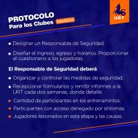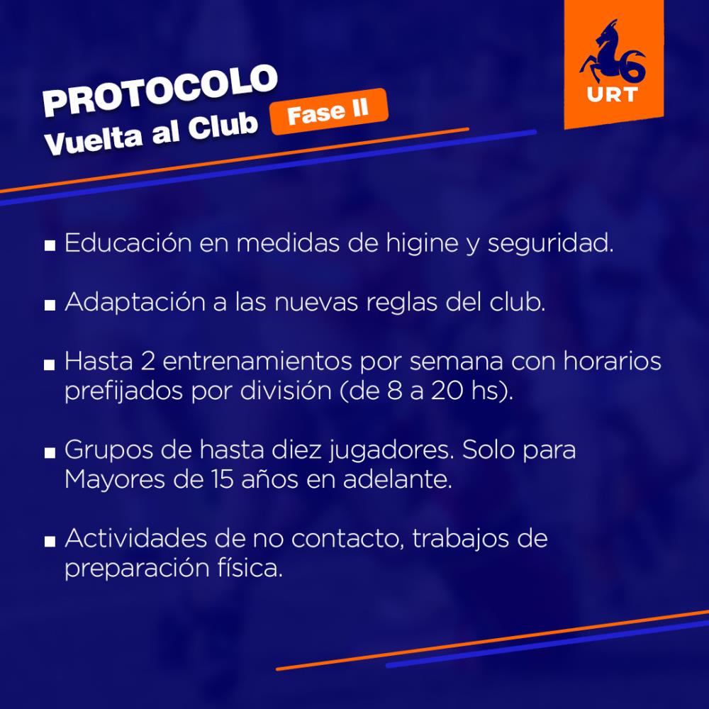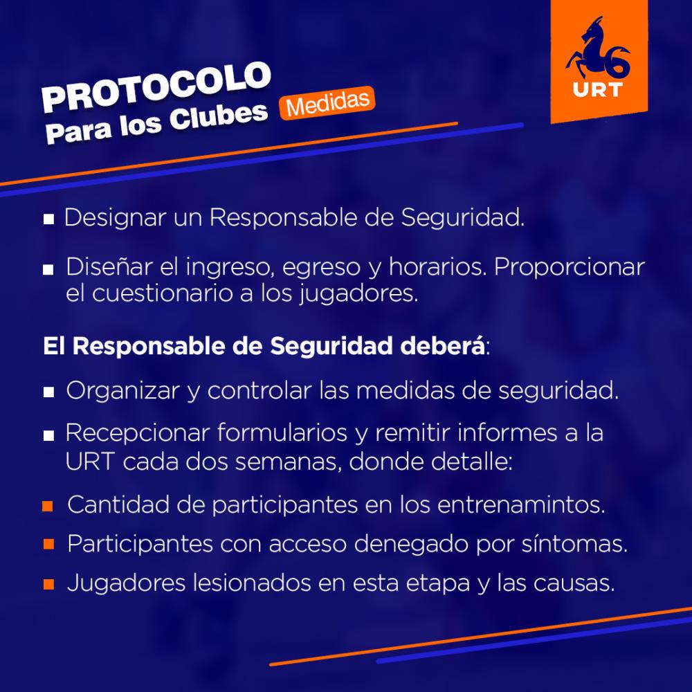Los clubes deberán designar un referente de seguridad que proporcione normas para el ingreso y egreso al club según el Protocolo URT. El referente deberá garantizar el orden de los horarios, el diseño y educación en el plan.
