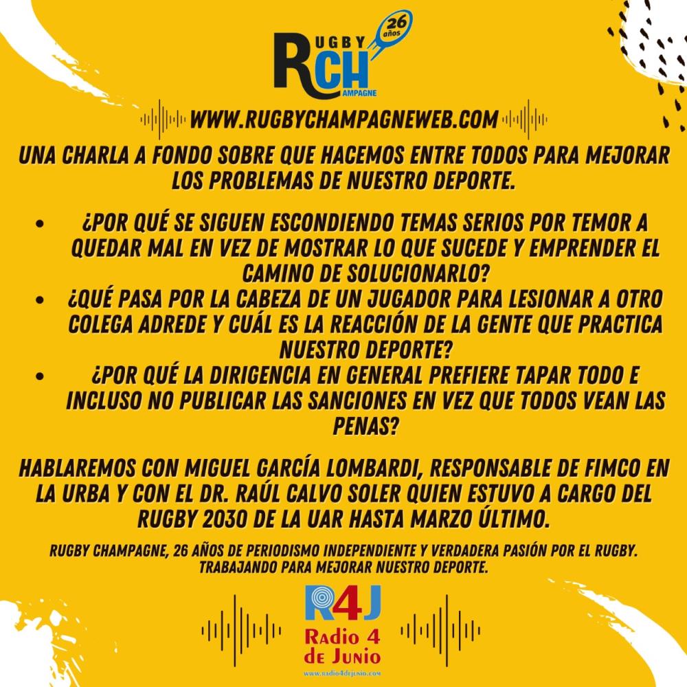 Galería de Imagenes Hablaremos con Miguel García Lombardi, responsable de FIMCO de la URBA y con el Dr. Raúl Calvo Soler, quién estuvo a cargo del RUGBY 2030 de la UAR hasta marzo último. EN EL PROGRAMA DE HOY: UNA CHARLA A FONDO SOBRE QUE HACEMOS ENTRE TODOS PARA MEJORAR LOS PROBLEMAS DE NUESTRO DEPORTE. ¿PORQUE SE SIGUEN ESCONDIENDO TEMAS SERIOS POR TEMOR A QUEDAR MAL EN VEZ DE MOSTRAR LO QUE SUCEDE Y EMPRENDER EL CAMINO DE SOLUCIONARLO?. ¿QUE PASA POR LA CABEZA DE UN JUGADOR PARA LESIONAR A OTRO COLEGA ADREDE Y CUAL ES LA REACCIÓN DE LA GENTE QUE PRACTICA A ESE DEPORTE?. ¿PORQUE LA DIRIGENCIA EN GENERAL PREFIERE TAPAR TODO E INCLUSO NO PUBLICAR LAS SANCIONES EN VEZ QUE TODOS VEAN LAS PENAS?. LOS VALORES DEL RUGBY EN CENTRO NAVAL VS ST BRENDANS Y EN LOS MATREROS VS PUEYRREDÓN. RUGBY CHAMPAGNE, 26 AÑOS DE PERIODISMO INDEPENDIENTE Y VERDADERA PASIÓN POR EL RUGBY. TRABAJANDO PARA MEJORAR NUESTRO DEPORTE. Galería de Imagenes