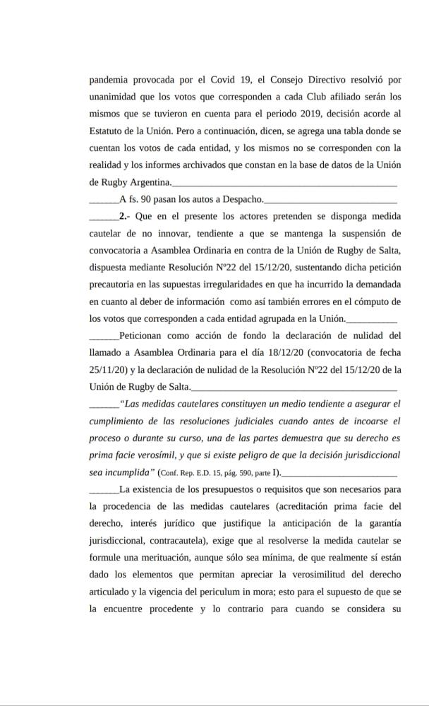 “2.- Que en el presente los actores pretenden se disponga medida cautelar de no innovar, tendiente a que se mantenga la suspensión de convocatoria a Asamblea Ordinaria en contra de la Unión de Rugby de Salta, dispuesta mediante Resolución Nº22 del 15/12/20, sustentando dicha petición precautoria en las supuestas irregularidades en que ha incurrido la demandada en cuanto al deber de información como así también errores en el cómputo de los votos que corresponden a cada entidad agrupada en la Unión.”