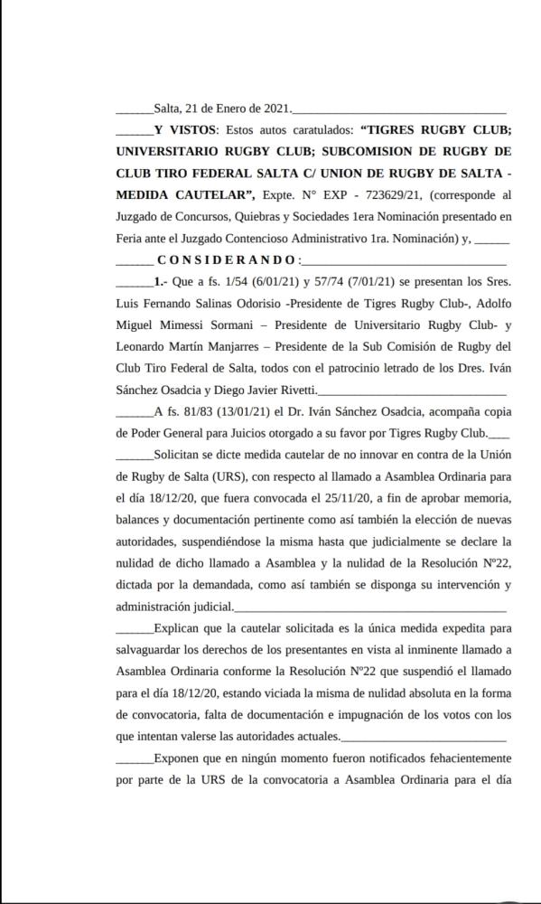 El viernes 22 de enero pasado el Juzgado de Concursos, quiebras y Sociedades N 2 de Salta ordenó una medida cautelar de Prohibición de No Innovar a la Unión de Rugby de Salta. La medida fue solicitada por los Dres. Iván Sánchez Osadcia y Diego Rivetti en representación de los clubes Tigres rugby club, Universitario R.C. y la Subcomisión de rugby de Tiro Federal por las graves irregularidades tanto en la convocatoria a Asamblea para aprobar balances y gestión como para renovar autoridades, valiéndose para ello del conteo de votos atribuidos a cada club que no se corresponde con la realidad, otorgando así una posición dominante a otros clubes.
