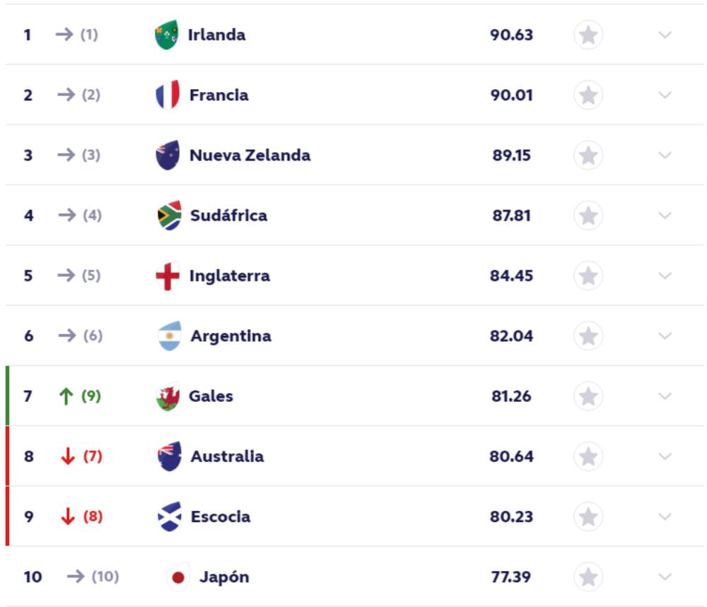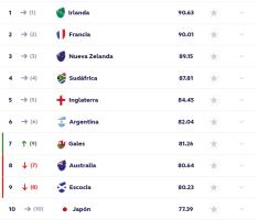 El primer lugar del ranking lo sigue ocupando Irlanda, con 90.63 puntos, luego de haber ganado 8 de sus últimos 10 partidos. Este fin de semana venció a Fiji en Dublin y sigue demostrando su buen momento.
