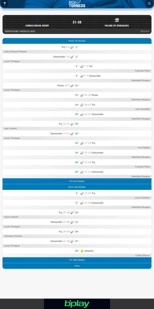 En el complemento la franquicia paraguaya estiró la distancia con un try de Lucas Sommer. Cobras marcó dos tries con Javier Coronel y Henrique Ferreira pero no le alcanzó.